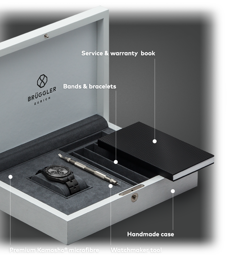 Owing to their high-quality promise, BRÜGGLER offers a four-year warranty period for its chronographs. The individually designed items are delivered in an upmarket watchbox, together with a personalised Service and Warranty Book and a handy watchmaker tool to change bracelets. In order to allow for thorough transparency, the chronographs’ test results are transferred into the BRÜGGLER Service and Warranty Book by the watchmaker personally.